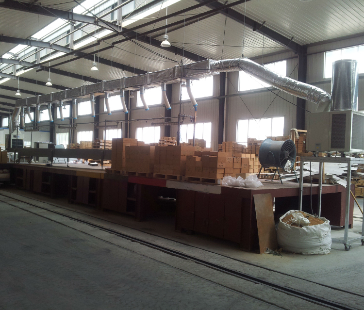 本场景为大型高标准厂房内的长条形生产线(如耐火材料/建材成型生产线),具备以下核心降温痛点: