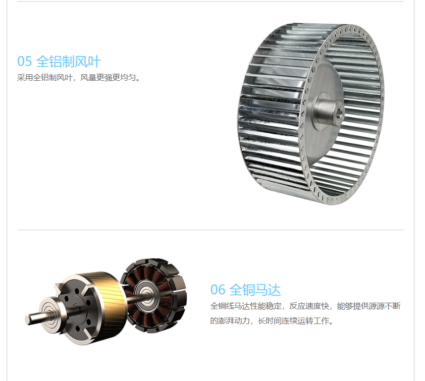3、采用铝制离心风叶,风力强劲、气流均匀、噪音低