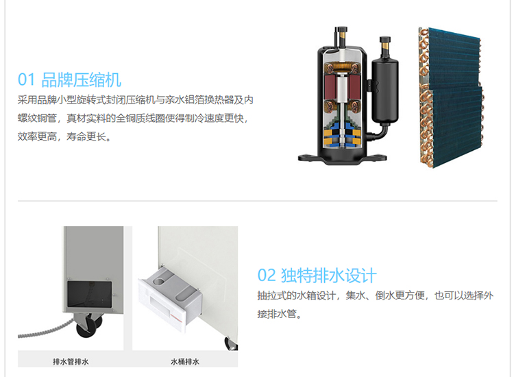 8、机身一体化设计,科学布局,可机内储水桶积水.也可接水管排水,附带除湿效果