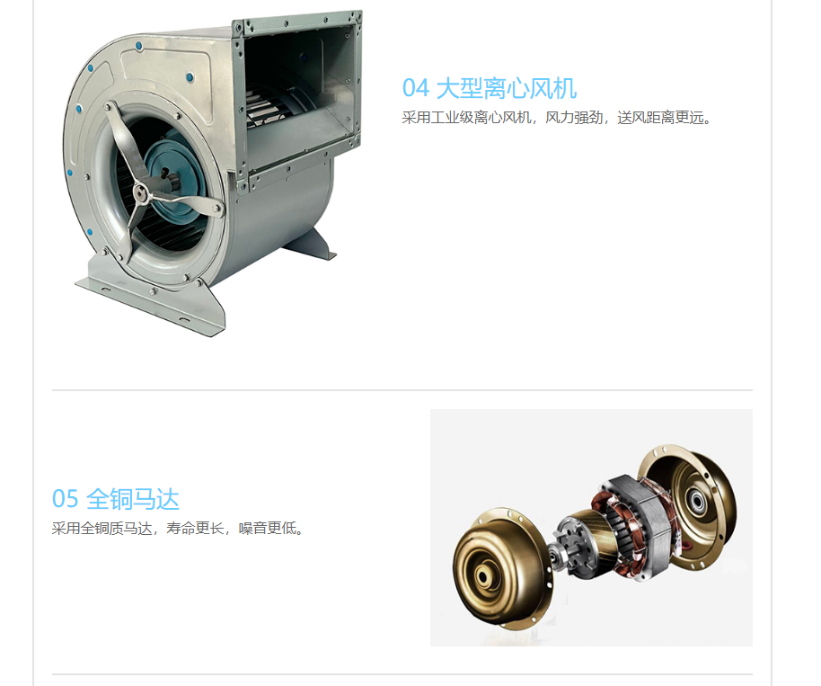 3、采用铝制离心风叶,风力强劲、气流均匀、噪音低