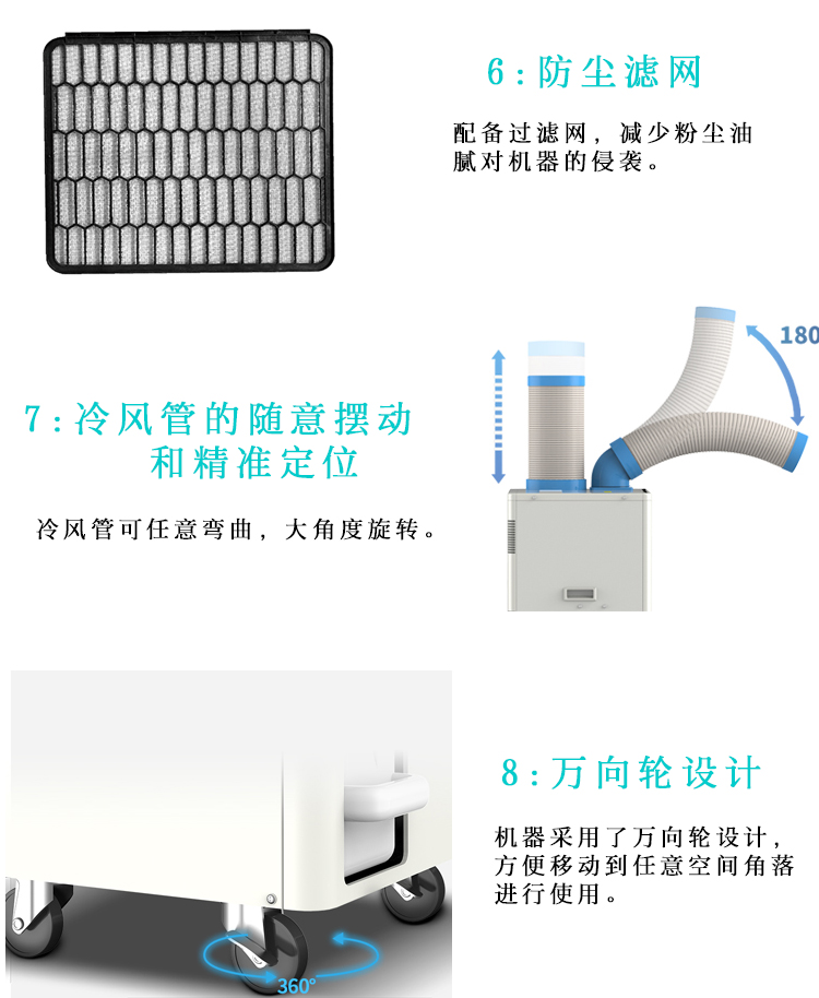 2、移动冷气机过滤网应定时清理干净(约2周一次),以维持移动冷气机除湿、除尘效率及寿命,同时避免细菌滋生。