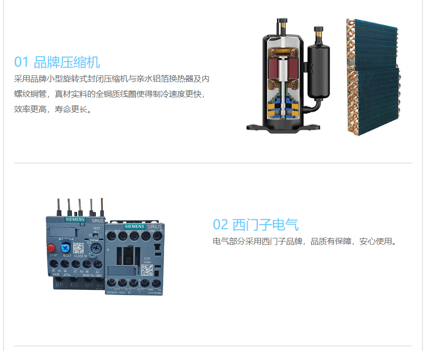 1. 采用全铜线品牌压缩机,性能稳定,故障率低